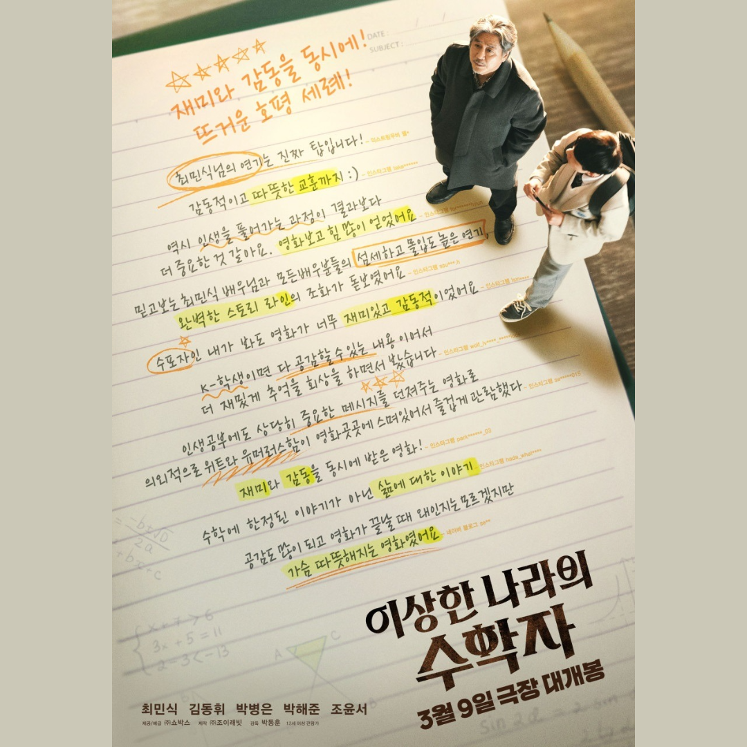 - 총평: "이상한 나라의 수학자"는 수학을 통해 삶의 진리를 이야기하는 따뜻하고 감동적인 영화입니다. 최민식의 명품 연기와 신예 김동휘의 풋풋한 매력이 어우러져 잔잔한 여운을 남깁니다. 자극적인 영화에 지친 관객들에게 추천하는 힐링 영화입니다.